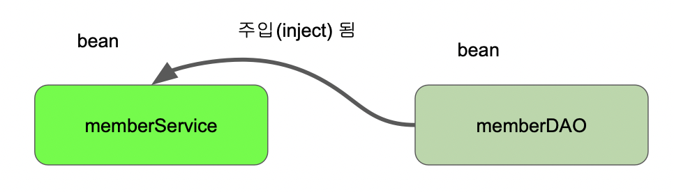 2) 객체 레퍼런스를 컨테이너로부터 주입 받아서, 실행 시에 동적으로 의존관계가 생성됨.