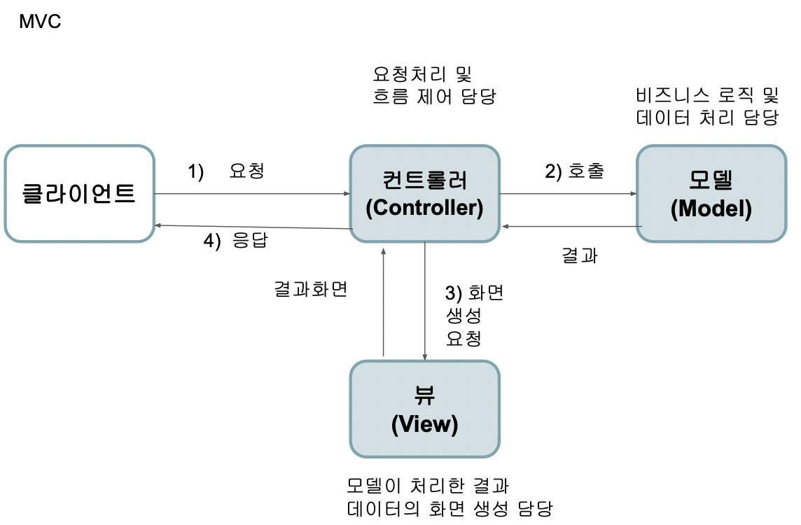 - 클라이언트 요청에 대해 모델과 뷰를 결정하여 전달