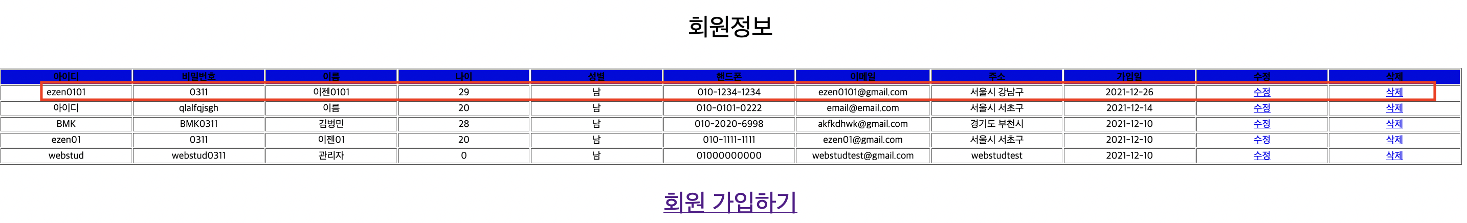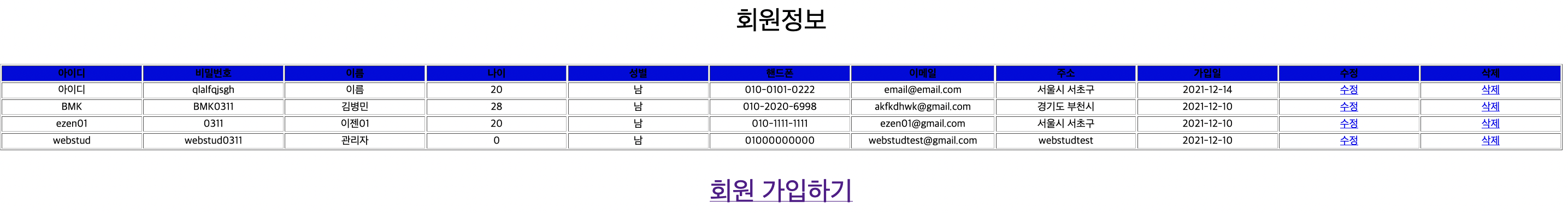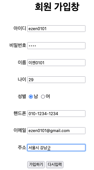 회원 가입하기 클릭 후, 회원정보 추가