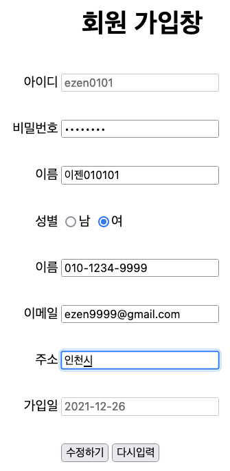 수정 버튼 클릭 후, 회원정보 수정