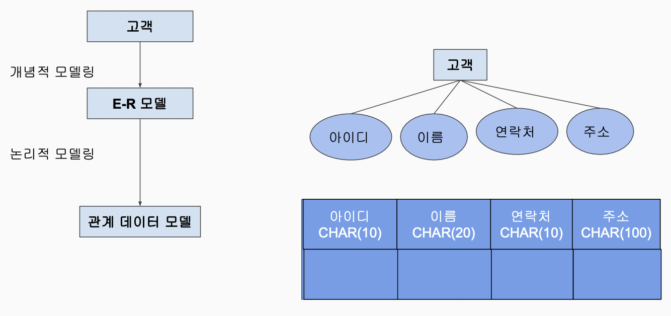 - 개념 세계의 데이터를 데이터베이스가 저장할 구조로 변화하는 과정