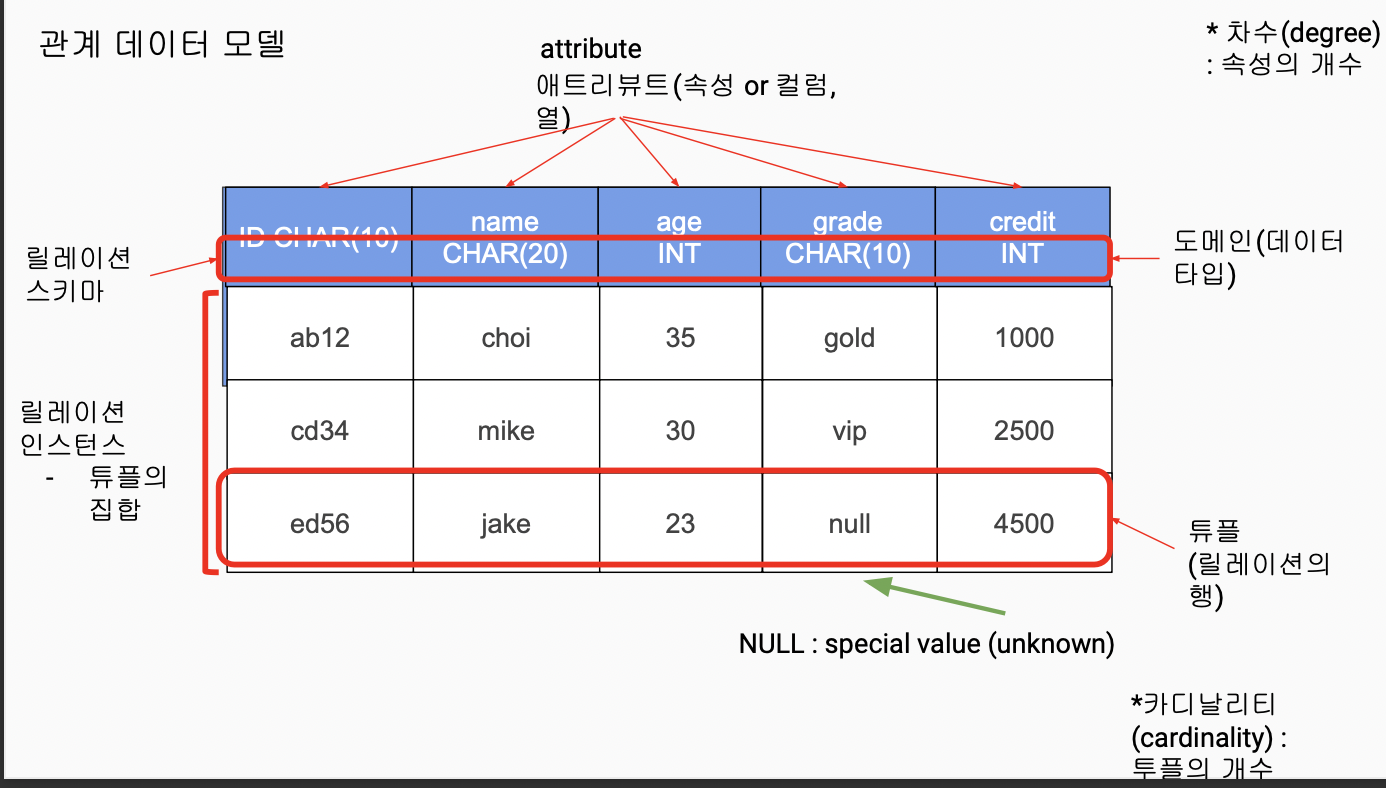 1) 개체에 대한 데이터를 저장하는 논리적 구조 - 릴레이션 (2차원의 테이블 구조)