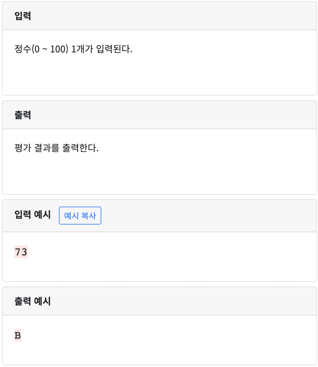 | CodeUp_Java 기초 100제 - [기초-조건/선택실행구조] 평가 입력받아 다르게 출력하기 69 (0) | 2022.02.13 |