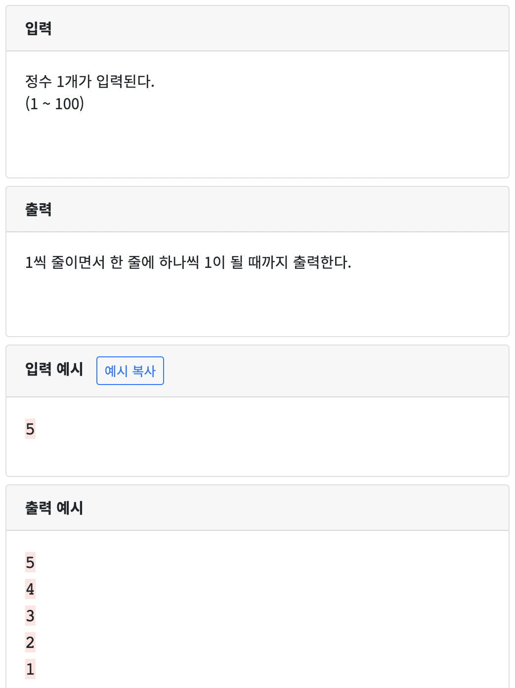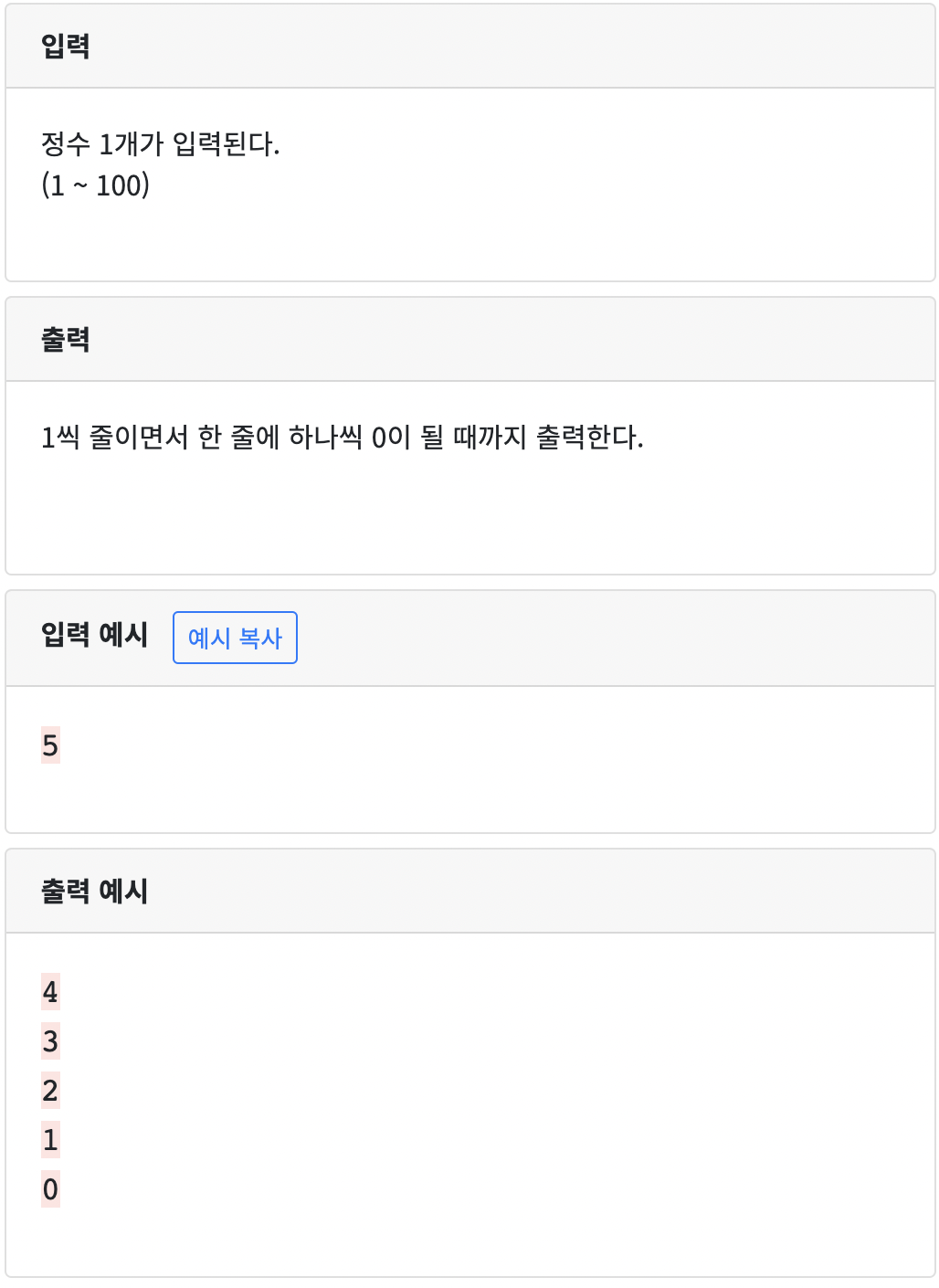 74 : 정수 1개 입력받아 카운트다운 출력하기1