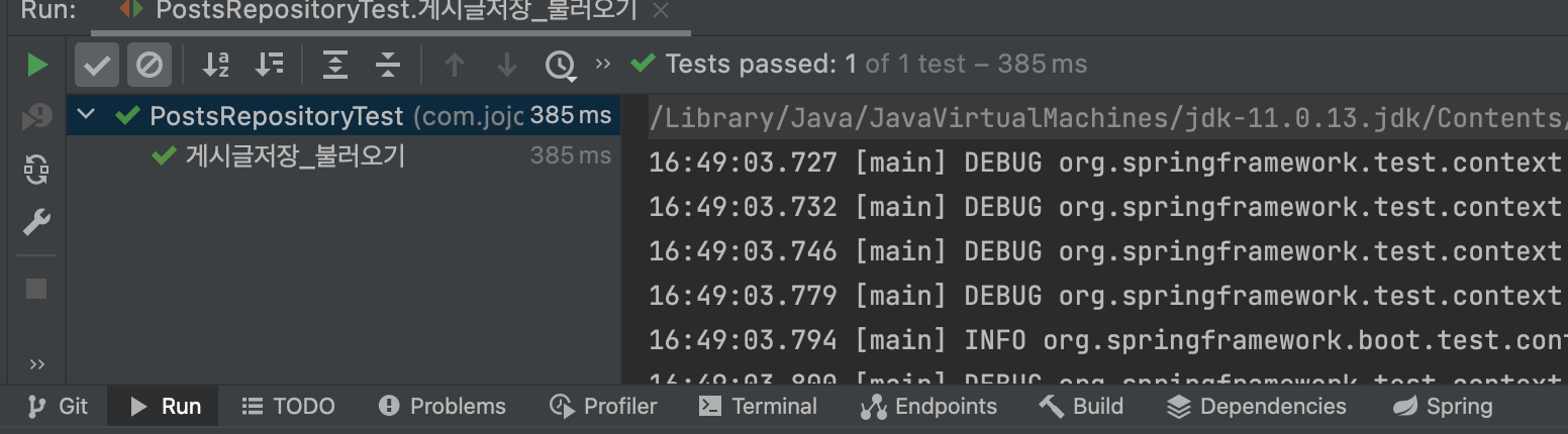 - PostsRepositoryTest 클래스에 테스트 메소드 추가