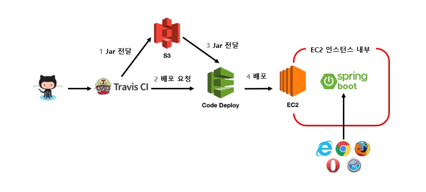 - S3를 비롯한 AWS 서비스와 Travis CI를 연동하게 되면 전체 구조