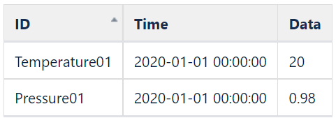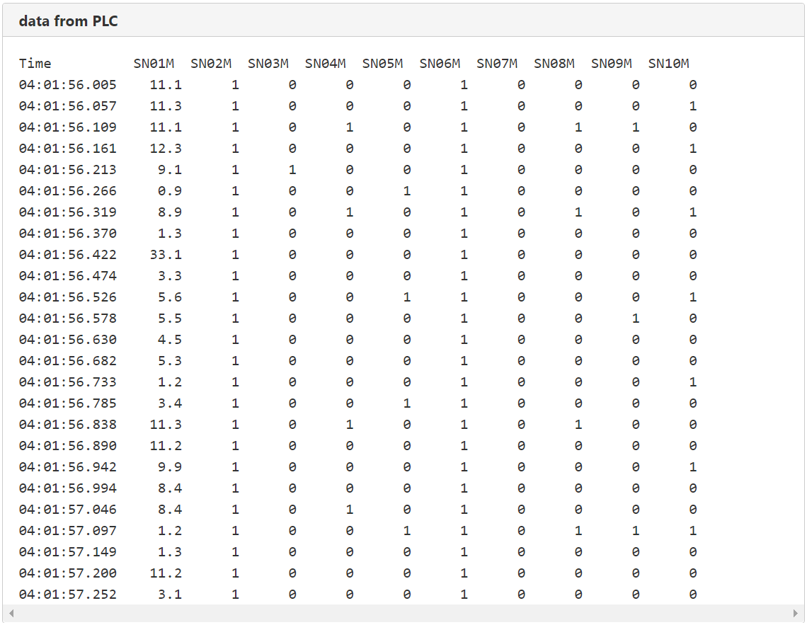- 실제로 현장 (PLC : Programmable Logic Control) 에서 사용되는 센서 데이터는 위의 세 가지 속성으로만 표현되지 않고, 대부분의 경우 아래와 같이 다수의 센서 데이터가 모여진 형태로 저장되는 것이 일반적임