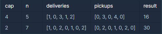 트럭에 실을 수 있는 재활용 택배 상자의 최대 개수를 나타내는 정수 cap, 배달할 집의 개수를 나타내는 정수 n, 각 집에 배달할 재활용 택배 상자의 개수를 담은 1차원 정수 배열 deliveries와 각 집에서 수거할 빈 재활용 택배 상자의 개수를 담은 1차원 정수 배열 pickups가 매개변수로 주어집니다. 이때, 트럭 하나로 모든 배달과 수거를 마치고 물류창고까지 돌아올 수 있는 최소 이동 거리를 return 하도록 solution 함수를 완성해 주세요.
