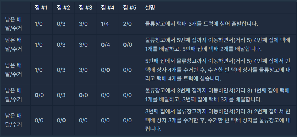 다음은 cap=4 일 때, 최소 거리로 이동하면서 5개의 집에 배달 및 수거하는 과정을 나타낸 예시입니다.