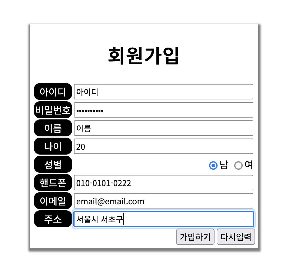 회원가입 페이지 폼(CSS는 회원가입 페이지 작성 목록에 있으므로, 이 주제에서는 제외시킴)
