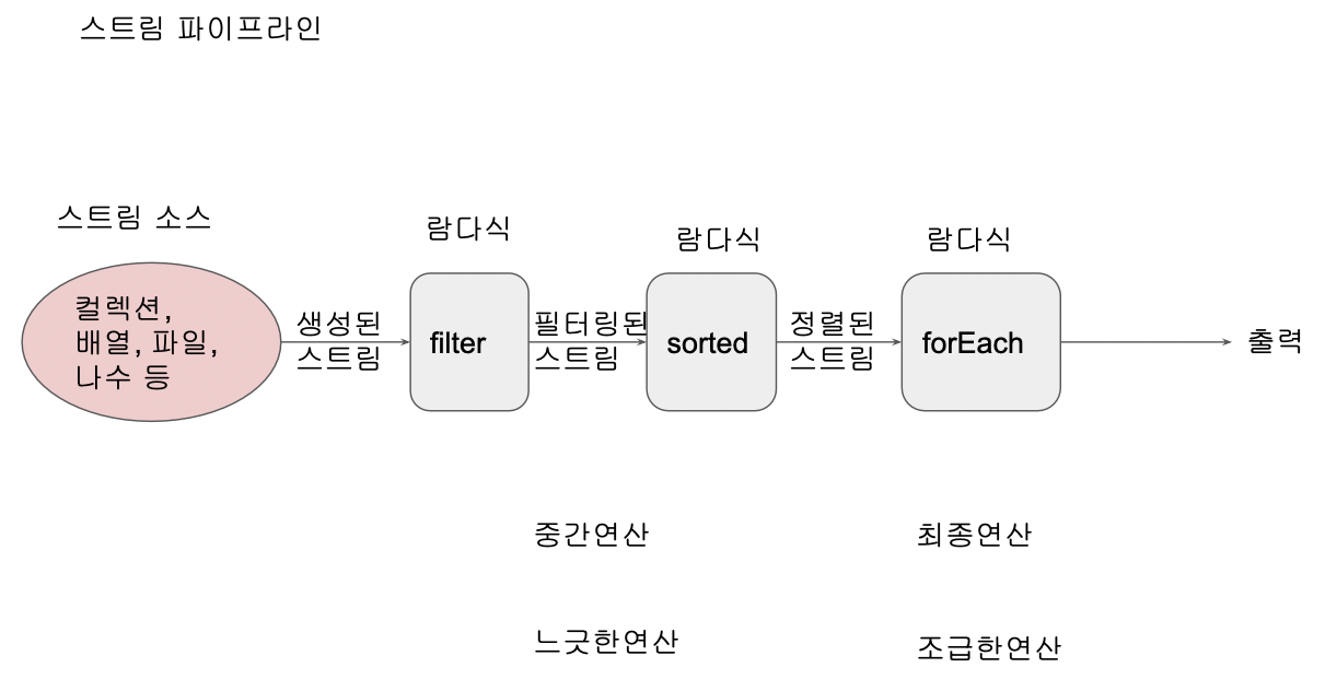 4) 스트림 연산은 중간 연산과 최종 연산으로 구분됨.(스트림 파이브라인)