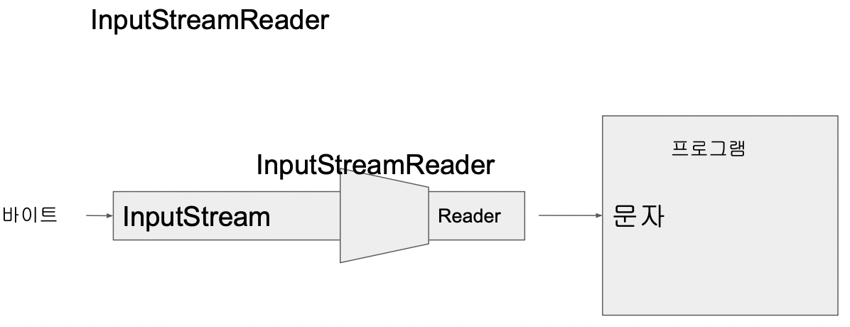 - InputStreamReader : 바이트 단위로 읽은 자료를 문자로 변환해주는 보조 스트림 클래스임.