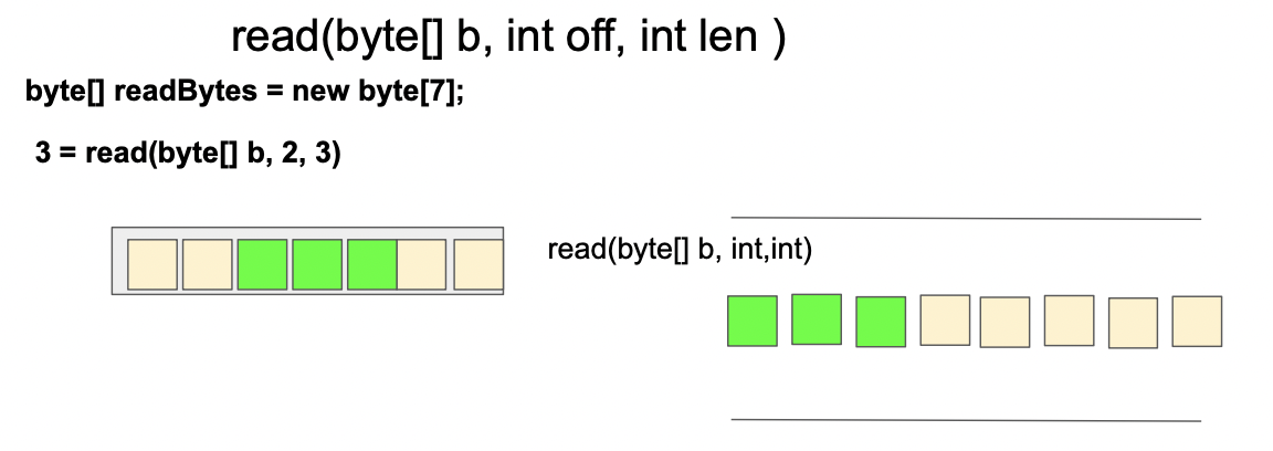 - int read(char[] buf, int off, int len) : 입력 스트림으로부터 buf 배열의