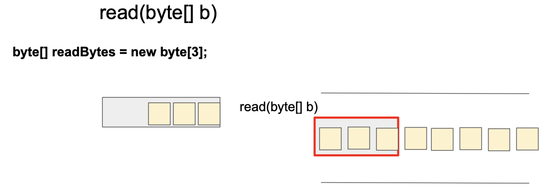 - int read(byte[] b) : 입력 스트림으로부터 b[] 크기의 자료를 b[]에 읽어들임.