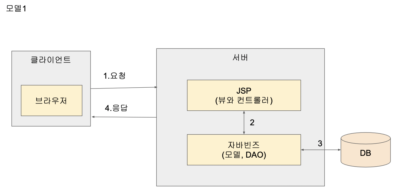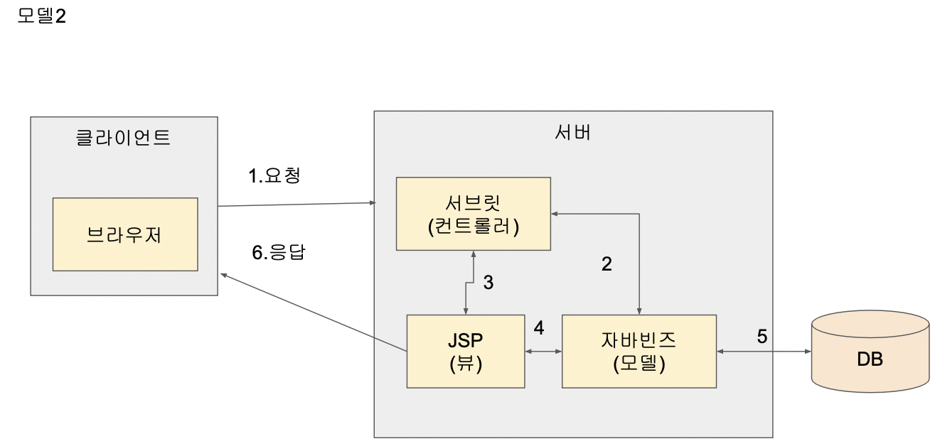 - 사용자 요청을 JSP가 받아 모델을 호출함